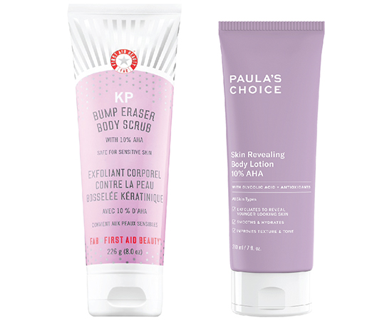 Both Dr. Husain and Dr. Turegano recommend finding an exfoliating moisturizer, specifically, for best results. Look for urea, salicylic acid, lactic acid, glycolic acid, and retinoids. For example, First Aid Beauty KP Bump Eraser Body Scrub with 10% AHA, $28, contains a mix of glycolic acid, lactic acid, physical exfoliants, and soothing bisabolol. If you prefer salicylic acid, try Paula’s Choice Weightless Body Treatment 2% BHA, $28.