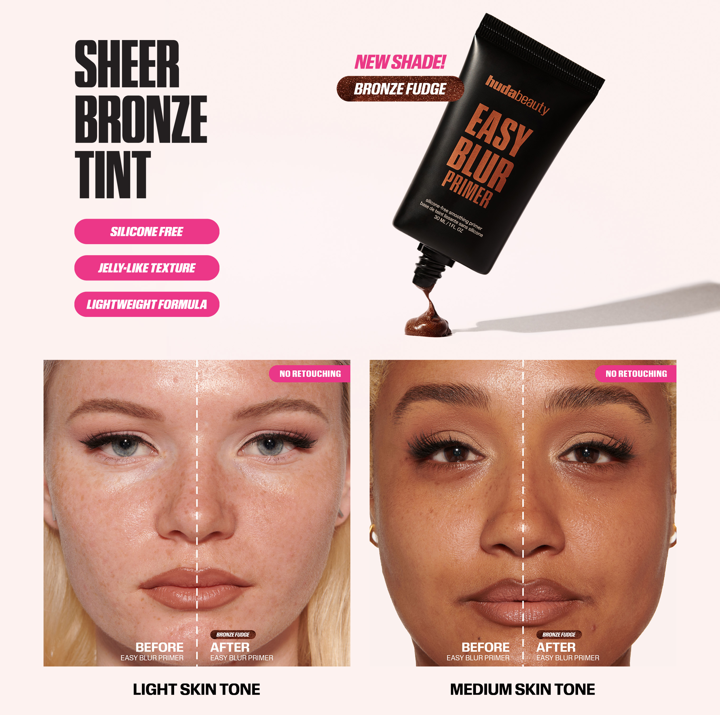 • Step 1: Prime with our OG Easy Blur Primer, or NEW Easy Blur Primer in Bronze Fudge; Huda recommends using two fingers length worth of product.
